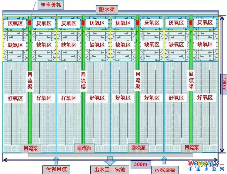 我們在生物池里面主要是這幾塊,第一塊原來的生物水池170萬噸分兩個(gè)系列,80萬噸系列和90萬噸系列,80萬噸是20萬噸一組,中間的隔墻沒有考慮單倉檢修,這次改造的時(shí)候是40萬噸/組檢修加內(nèi)回流,這次不光要改造缺氧好氧分區(qū)還要改造內(nèi)回流。
