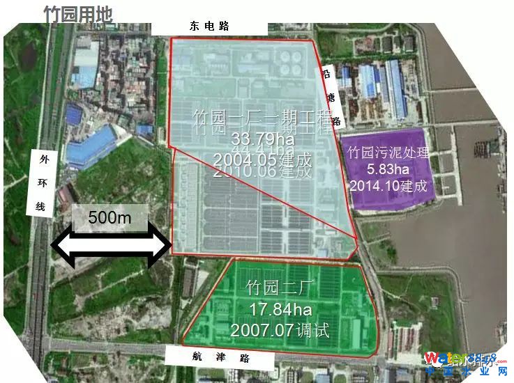 這個(gè)廠歷史比較悠久,一廠一期在2004年5月份建成,是一級強(qiáng)化的處理工藝,在2010年6月份建了二期提標(biāo)工程,提標(biāo)帶脫氮功能的強(qiáng)化。竹園二廠是07年7月調(diào)試,分別是170萬立方米/天和50萬立方米/天,整個(gè)可以用的地塊是在范圍內(nèi)做的提標(biāo)。