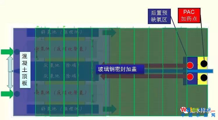 首先從外回流進(jìn)來的水在里面進(jìn)入前端跟原水進(jìn)行混合,這樣在里面通過攪拌推流設(shè)施把原來的好氧、厭氧、缺氧進(jìn)行分區(qū),這樣在好氧設(shè)立了搖擺池,好氧區(qū)在不同時(shí)間也可以作為缺氧區(qū)用,我們盡量在原來的土建不改造的情況下進(jìn)行分割,也做了很多數(shù)學(xué)模型模擬和軟件模擬,后置區(qū)加了預(yù)缺氧區(qū),這樣就有兩塊,一塊是控制除磷,另一塊是控制加藥,盡量控制出水端溶解氧較低。這一塊也是經(jīng)過多次實(shí)驗(yàn),在同步加藥平衡以后對生物池污泥活性影響是比較小的,所以我們做了末端加藥再加沉淀過濾。最后采用玻璃鋼加蓋除臭,整個(gè)改造時(shí)間當(dāng)時(shí)是按19年規(guī)劃的,現(xiàn)在最新的文件有所調(diào)整,是分期來調(diào)整施工順序。
