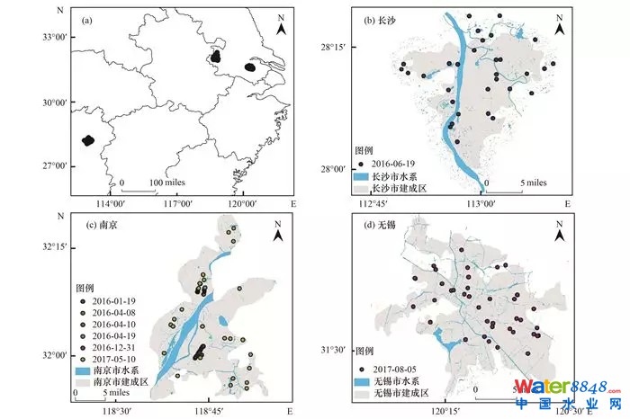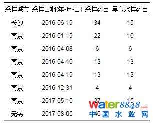 2016~2017年采集了長(zhǎng)沙、南京和無(wú)錫的城市黑臭水體共計(jì)85個(gè)樣點(diǎn), 非黑臭水體共計(jì)80個(gè)樣點(diǎn)。