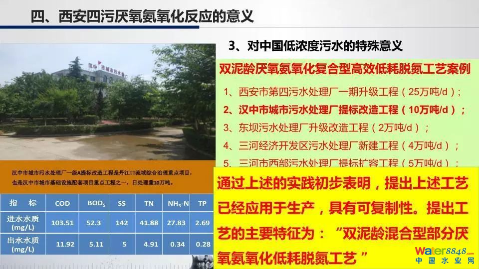 三是我國八大流域COD小于150mg/L占了50%以上,平均在55%以上,存在著低COD高總氮的情況,采用什么樣的技術(shù),一直是個難題。最近在漢中污水處理廠采用這個技術(shù),在COD為100mg/L、總氮40mg/L的情況下,出水總氮達到了5mg/L以下,因此,這一技術(shù)對低濃度污水的提標改造非常有意義。表中列出了通過改進后工藝正在實施和設(shè)計中的一些工程信息。所以。通過上述的實踐初步表明了上述工藝已經(jīng)可以應(yīng)用于生產(chǎn),并且具有可復(fù)制性,而工藝的主要特征是雙泥齡、混合型部分厭氧氨氧化的低耗脫氮工藝。