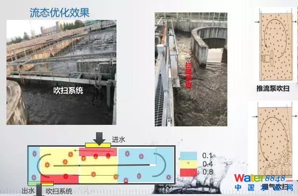 為什么會發(fā)生這種反應(yīng)?要對改造過程中的一些問題進行探究。眾所周知,在填料改造過程中,如果不恰當?shù)卦O(shè)置攔網(wǎng),填料會在攔網(wǎng)處堆積。而攔網(wǎng)設(shè)置的地點和設(shè)置方式非常有講究。好氧區(qū)的填料由于曝氣以后水的密度和填料的密度相接近,所以很容易形成流化。而缺氧區(qū)不采用曝氣,僅僅采用攪拌要實現(xiàn)充分流化,是存在一定難度的。西安第四污水廠的改造過程設(shè)立了吹掃系統(tǒng),采用攪拌和曝氣雙重吹掃的機制。當然,吹掃設(shè)備一般是在填料攔網(wǎng)發(fā)生堵塞時才啟用。