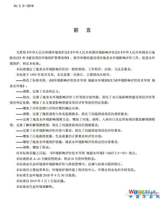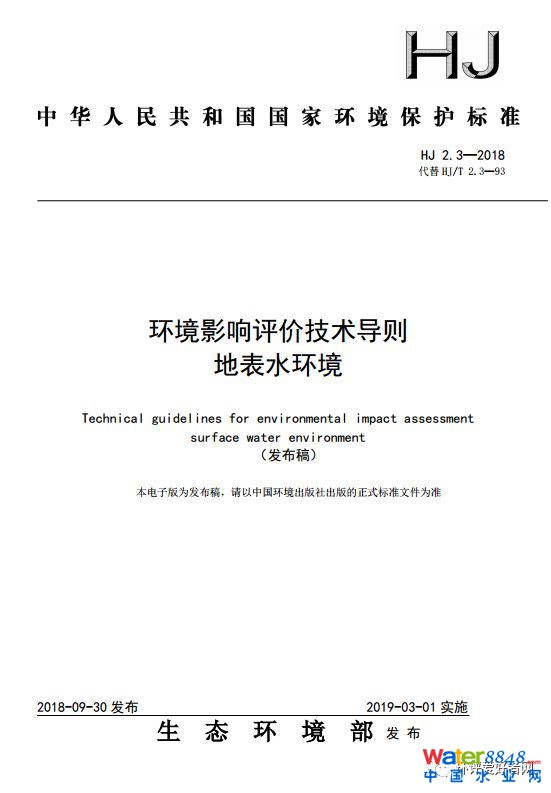 新《環(huán)境影響評價技術(shù)導(dǎo)則 地表水環(huán)境》(HJ 2.3-2018)發(fā)布,自2019年3月1日起實施