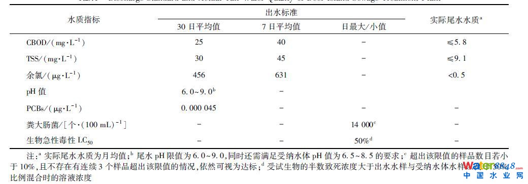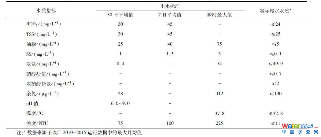 鹿島污水處理廠的處理尾水僅有一個排放口,雨季超出一級處理能力的水量將由指定的合流制污水溢流(CSOs)排放口排出。旱季處理尾水水質(zhì)的主要濃度指標及處理尾水的實際水質(zhì)情況如表1所示。