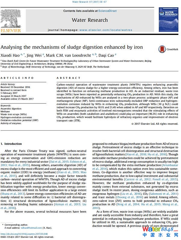 北京建筑大學郝曉地教授團隊——廢鐵屑強化剩余污泥厭氧消化機理研究