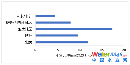 MBR市場(chǎng)增長(zhǎng)放緩亦可以從市場(chǎng)全球年復(fù)合增長(zhǎng)率(CAGR)和市場(chǎng)總額看出,CAGR可以體現(xiàn)某一產(chǎn)業(yè)增長(zhǎng)的潛力和預(yù)期。2008年MBR工藝處于鼎盛時(shí)期,全球水務(wù)市場(chǎng)分析師曾樂(lè)觀地預(yù)測(cè)國(guó)際MBR市場(chǎng)到2018年CAGR為22.4%,到2018年全球MBR市場(chǎng)價(jià)值總額預(yù)計(jì)達(dá)到34.4億美元。但是,英國(guó)BBC Research最新報(bào)告顯示,2014年全球MBR市場(chǎng)總額為4.257億美元,到2019年預(yù)計(jì)僅達(dá)到7.777億美元,年CAGR僅為12.8%,這與2008年預(yù)測(cè)相差甚遠(yuǎn)。BBC Research同時(shí)也給出了全球各大洲MBR市場(chǎng)CAGR預(yù)測(cè),如圖2所示。圖2顯示,2014年后亞太地區(qū)MBR市場(chǎng)年復(fù)合增長(zhǎng)率高于歐洲和北美。結(jié)合圖1數(shù)據(jù)可知,2014年后世界MBR市場(chǎng)增長(zhǎng)主要由亞太地區(qū)引導(dǎo),這其中,中國(guó)地區(qū)增長(zhǎng)量對(duì)亞太地區(qū)總增長(zhǎng)有著絕對(duì)的份額貢獻(xiàn)。