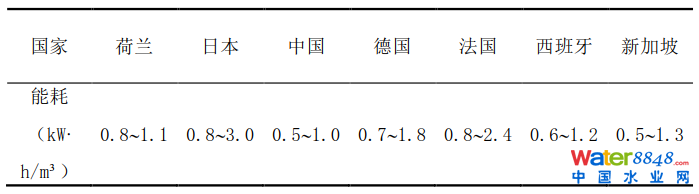 經(jīng)半個(gè)世紀(jì)發(fā)展,通過(guò)改變曝氣方式使曝氣能耗已顯著降低,致使MBR工藝能耗亦大為降低,已從最初>5kW∙h/m³降到目前平均2kW∙h/m³水平。表2總結(jié)了一些國(guó)家應(yīng)用MBR工藝能耗情況。與CAS工藝平均能耗0.30kW∙h/m³相比,MBR工藝能耗要高出60%~900%。正因能耗問(wèn)題讓膜生產(chǎn)大國(guó)的日本停止了對(duì)大型市政MBR項(xiàng)目審批。于是,日本2013年后著手開(kāi)始研發(fā)新的MBR技術(shù),旨在將其能耗控制在≤0.4 kW∙h/m³。