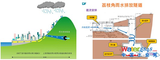 以位于九龍西北部的荔枝角雨水排水隧道為例,工程主要采用半山截流的方法,截取雨水,經(jīng)分支隧道流入靜水池,再經(jīng)主隧道排到海港,為荔枝角、深水埗、長(zhǎng)沙灣等下游區(qū)域提供了防洪保障。傳統(tǒng)的防洪方法是在市區(qū)拓建排水管道,而隧道截流是創(chuàng)新的防洪方法,它從源頭著手,建造雨水排放隧道,在半山截流雨水,再繞過稠密的下游市區(qū),直接排放入海。該工程于2008年至2012年建成。