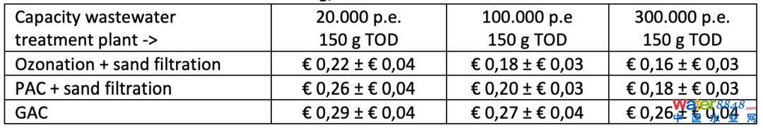 荷蘭的水應(yīng)用研究基金會(huì)STOWA、荷蘭水委會(huì)De Dommel,以及一個(gè)新興污染物的跨國(guó)行動(dòng)項(xiàng)目組TAPES其實(shí)早在2015年就發(fā)表過(guò)一份技術(shù)報(bào)告,對(duì)三種工藝在不同處理規(guī)模項(xiàng)目進(jìn)行成本評(píng)估,結(jié)果如下: