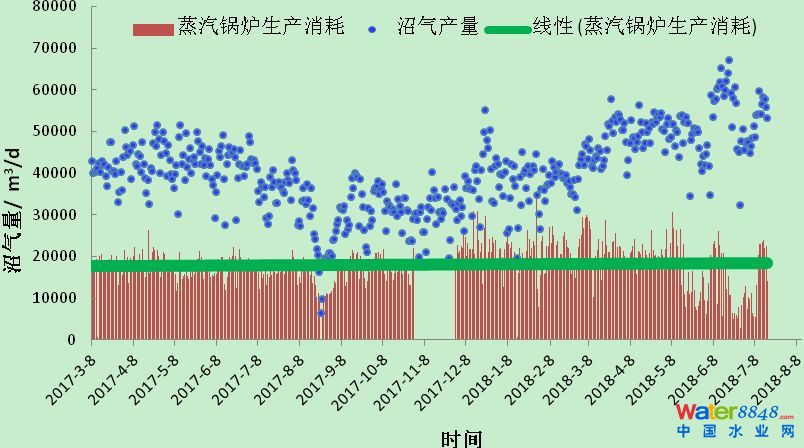 從運(yùn)行時(shí)段看,沼氣產(chǎn)量約40319m3/d,其中用于生產(chǎn)蒸汽消耗量約18150m3/d,沼氣富余量約22000m3/d。富余的沼氣,現(xiàn)況用于沼氣拖動(dòng)鼓風(fēng)機(jī)約7219m3/d。供暖季節(jié),供熱的熱水鍋爐已經(jīng)采用沼氣作為氣源。由于現(xiàn)況沼氣拖動(dòng)鼓風(fēng)機(jī)(3臺(tái))使用年限超過10年,設(shè)備故障較多,利用的沼氣量有限,出現(xiàn)即使在供暖季,沼氣的富余量也較多,F(xiàn)況剩余沼氣通過廢氣燃燒器燒掉。
