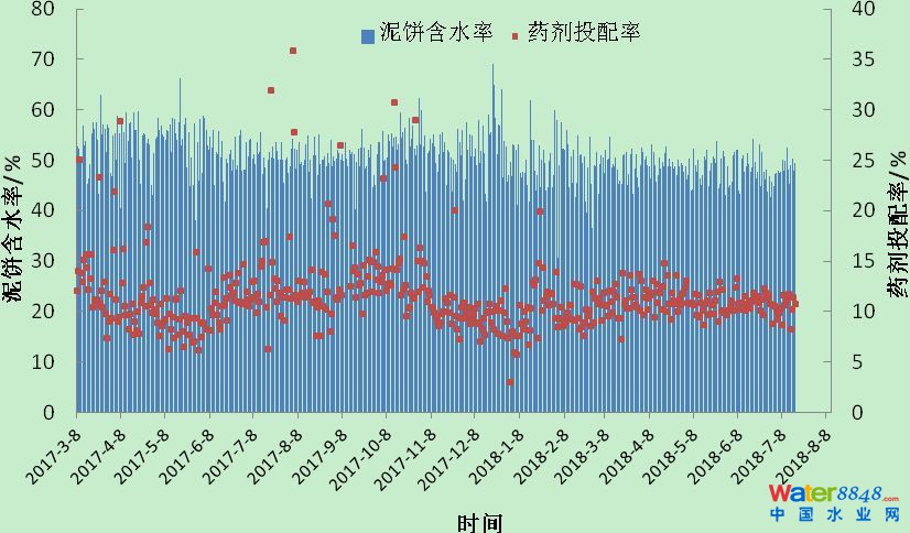 板框脫水藥劑使用的是復(fù)合藥劑,平均藥劑投配率(t/tDS)為11.4%。