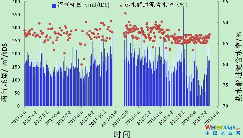 熱水解生產(chǎn)需要蒸汽。蒸汽來自消化池產(chǎn)的沼氣驅(qū)動(dòng)的蒸汽鍋爐。生產(chǎn)中引入熱水解噸干泥沼氣耗量(m3/tDS)指標(biāo)。運(yùn)行時(shí)段內(nèi),熱水解進(jìn)泥含水率平均為86.99%,噸干泥沼氣耗量平均為158.4m3/tDS。