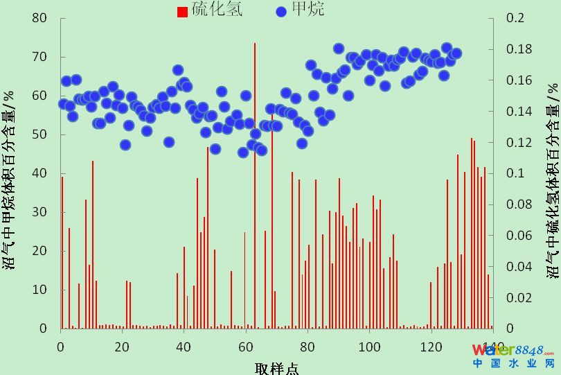沼氣中甲烷含量(體積分?jǐn)?shù))平均為60%。沼氣中硫化氫含量(體積分?jǐn)?shù))為0.135%。