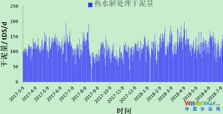 熱水解共3條生產(chǎn)線,日常運(yùn)轉(zhuǎn)2條生產(chǎn)線,平均日處理量為117tDS/d,為設(shè)計(jì)負(fù)荷(180tDS/d)的65%。