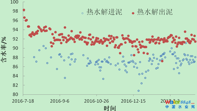 啟動(dòng)時(shí),熱水解進(jìn)泥為濃縮后預(yù)脫水的剩余污泥,進(jìn)泥平均含水率為87.1%。采用剩余污泥,一方面是急于驗(yàn)證熱水解對(duì)活性污泥破壁的實(shí)際效果,另一方面,也是考慮到剩余污泥直接脫水比較困難。污泥經(jīng)熱水解后,平均含水率為91.8%。熱水解處理后出泥溫度為101~107℃,還需降溫,方可進(jìn)入消化池。