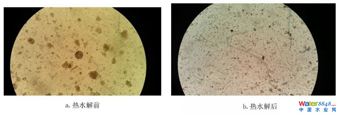 圖2 熱水解前后微生物鏡檢(目鏡×物鏡,10×20)