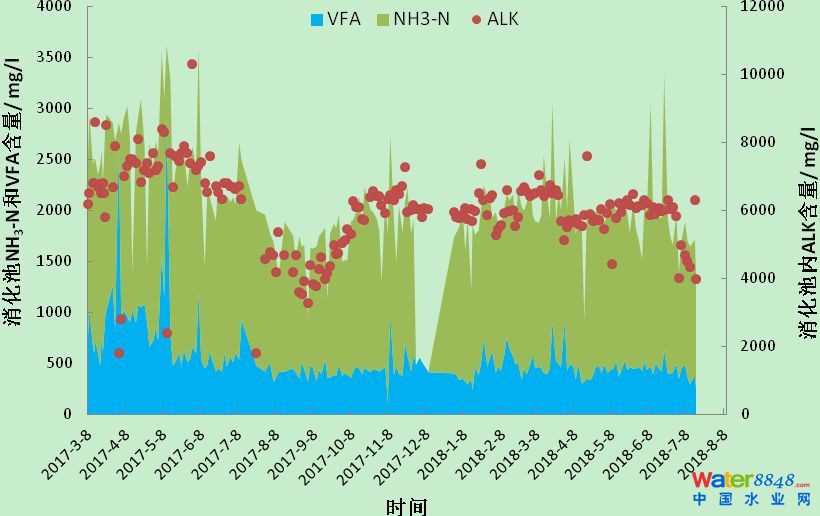 運(yùn)行時(shí)段內(nèi),消化池內(nèi)污泥脂肪酸(VFA)平均為552mg/L,堿度(ALK)平均值為6052mg/L,氨氮平均值為1532mg/L。酸堿比<0.1。有機(jī)物分解率平均45.06%,超過設(shè)計(jì)目標(biāo)值40%。分解單位公斤有機(jī)物沼氣產(chǎn)量為1.17m3/VSS,消化池有機(jī)負(fù)荷為1.35kgVSS/(m3·d)。