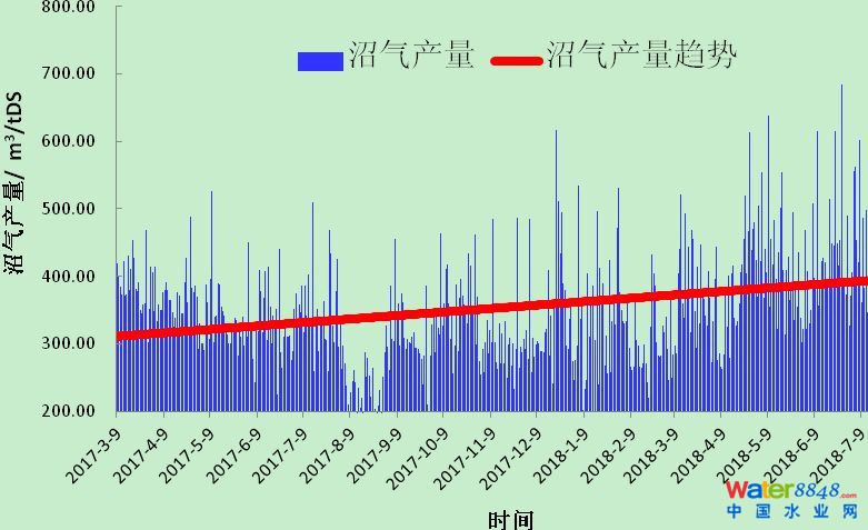 ①沼氣產(chǎn)氣量大于350m3/tDS,超過設(shè)計(jì)值222m3/tDS。