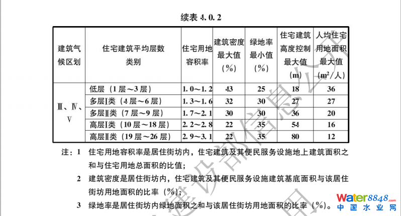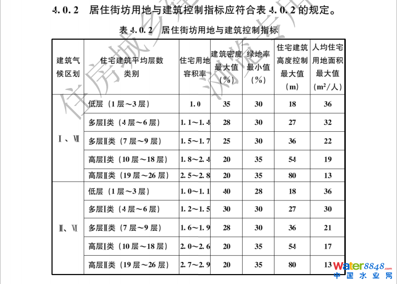 4.0.2居住街坊用地與建筑控制指標應符合表4. 0. 2的規(guī)定。