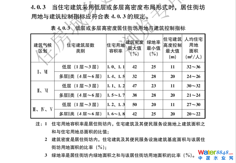 4.0.3當住宅建筑采用低層或多層高密度布局形式時,居住街坊用地與建筑控制指標應符合表4.0.3的規(guī)定。