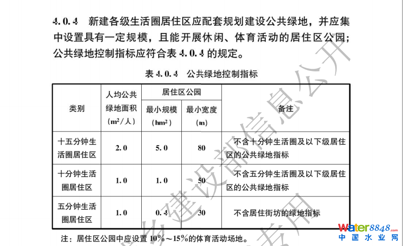 4.0.4新建各級生活圈居住區(qū)應配套規(guī)劃建設公共綠地,并應集中設置具有一定規(guī)模,且能開展休閑、體育活動的居住區(qū)公園;公共綠地控制指標應符合表4.0.4的規(guī)定。