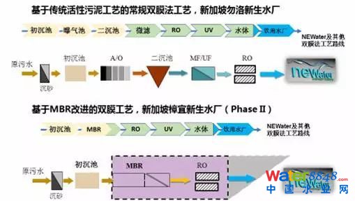在傳統(tǒng)二級(jí)處理的基礎(chǔ)上,”臭氧+活性炭過(guò)濾“工藝和”超濾+反滲透“雙膜工藝是最常用的兩條高品質(zhì)再生水處理技術(shù)路線。反滲透工藝的概念最早起源于美國(guó)21世紀(jì)水廠,之后在新加坡發(fā)揚(yáng)光大,成為解決區(qū)域水資源問(wèn)題的“利器”。新加坡第一座NEWater(新生水)處理廠在2002年建成,樟宜二期水廠被認(rèn)為是第二代NEWater主力工藝,二級(jí)處理未來(lái)計(jì)劃采用MBR工藝,這也是解決系統(tǒng)復(fù)雜性的一次嘗試。