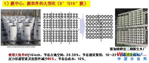 北控水務(wù)最初在曹妃甸建了一個(gè)5萬(wàn)噸的海水淡化廠,當(dāng)時(shí)我去參觀后一個(gè)非常深的感觸。我想,5萬(wàn)噸就需要上長(zhǎng)達(dá)百多米的廠房,百萬(wàn)噸不得20個(gè)這樣的廠子,占地面積太大。所以在做北京市科委的課題時(shí),我們就在想怎么減少占地降低一個(gè)Train能否做到5萬(wàn)噸。前幾年我到韓國(guó)的普漢參觀,10萬(wàn)噸新生水規(guī)模,膜堆是5000噸。我非常高興地看到在新加坡樟宜二期里,膜堆達(dá)到了的兩萬(wàn)噸的規(guī)模,新加坡一期工程的時(shí)候嘗試過(guò)16英寸,16英寸大型膜元件已經(jīng)取代傳統(tǒng)8英寸組件在全球最大海水淡化廠(sorek)得到應(yīng)用。這是我介紹的膜中心理念的應(yīng)用。膜中心不光是占地,而且是節(jié)省投資,同時(shí)管線大量減少、控制元件大量減少,這是膜中心的概念。