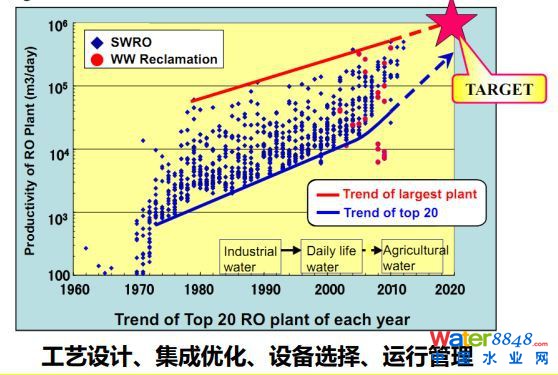 1、膜中心的核心在于反滲透膜堆(train)和膜元件兩個(gè)層面實(shí)現(xiàn)大型化