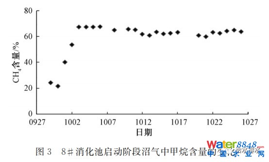 隨著消化系統(tǒng)調(diào)試開(kāi)始,沼氣中甲烷含量從無(wú)到有逐漸穩(wěn)定。由于沼氣中甲烷含量與處理泥質(zhì)有關(guān),在進(jìn)泥泥質(zhì)穩(wěn)定的前提下,沼氣中的甲烷含量趨于穩(wěn)定數(shù)值,可將沼氣成分中的甲烷含量作為調(diào)試穩(wěn)定的標(biāo)志。