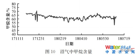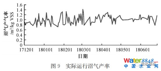 由圖9可見(jiàn),運(yùn)行期間的沼氣產(chǎn)率為0.75~1.4 m³/kgVSS,平均值為1 m³/kgVSS。數(shù)值波動(dòng)較小,比較穩(wěn)定。