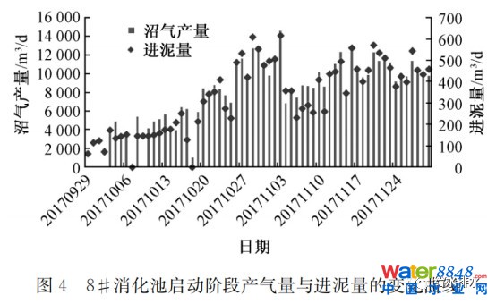 啟動(dòng)前,消化池實(shí)施污泥接種,種泥來(lái)自其他污泥處理中心的消化污泥。接種量為消化池有效容積的36%。