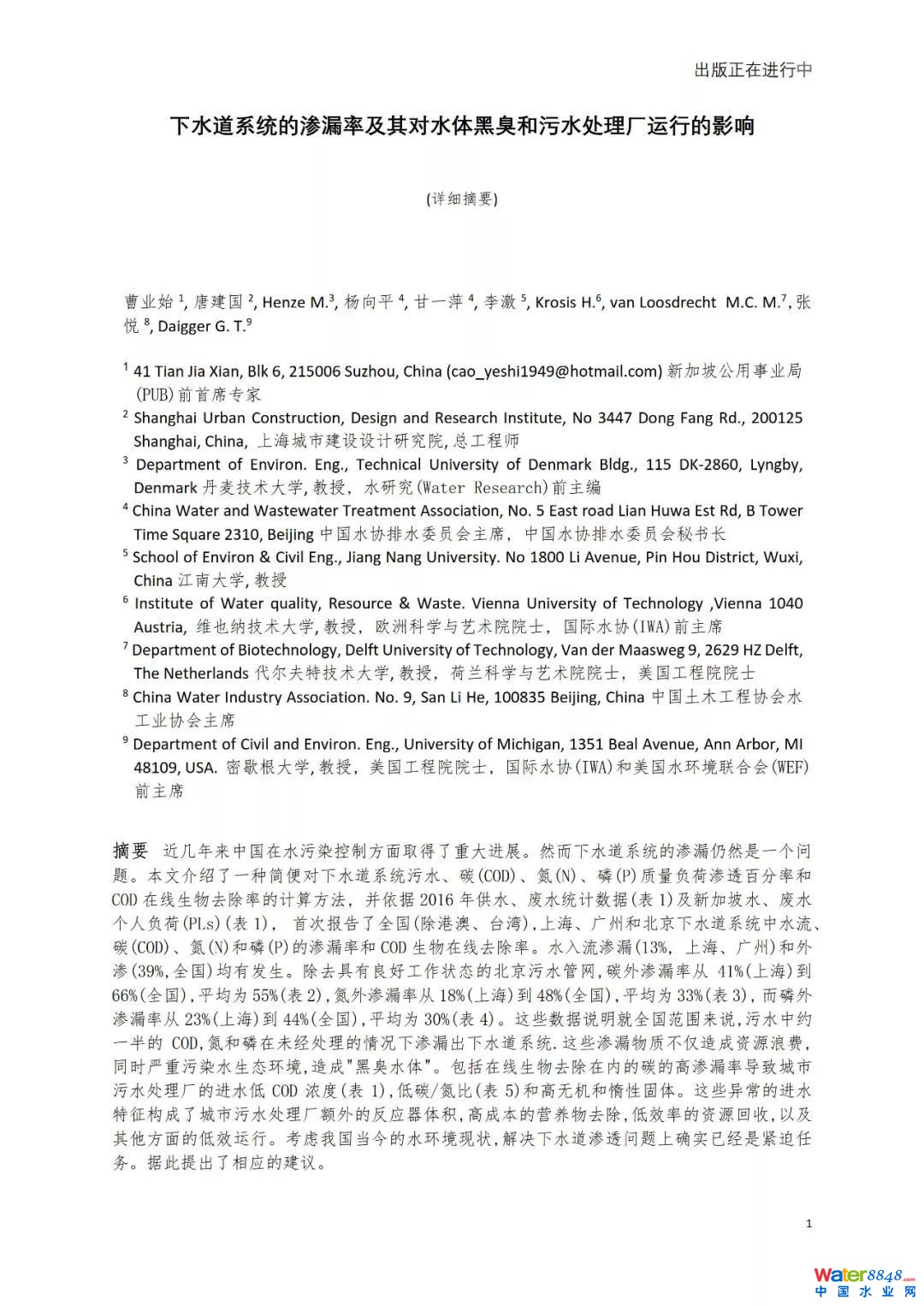 下水道系統(tǒng)的滲漏率及其對水體黑臭和污水處理廠運行的影響 認(rèn)識到下水道系統(tǒng)滲漏是我國許多地方水生態(tài)環(huán)境惡化和城市污水處理廠低效運行的根本原因,由曹業(yè)始領(lǐng)銜若干國內(nèi)外專家組成的小組進(jìn)行了相關(guān)