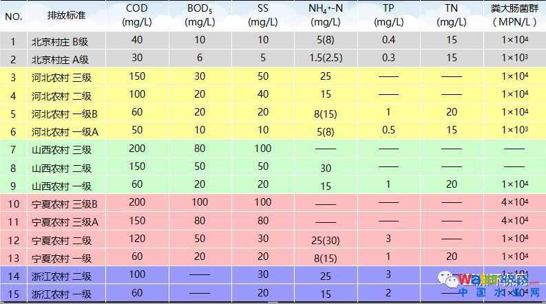 部分省市頒布了地方排放標(biāo)準(zhǔn)(北京、河北、山西、寧夏、浙江、上海等),各地對村莊污水的排放標(biāo)準(zhǔn)限值差異較大;