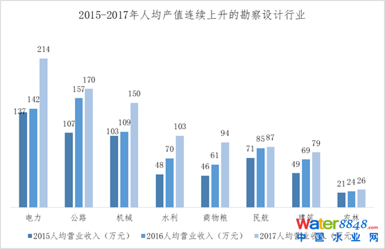 通過2015-2017年人均營業(yè)收入增長率均值分析,水利行業(yè)勘察設(shè)計企業(yè)近兩年人均營業(yè)收入增長最快,2016、2017年同比增速高達48%、46%,增速均值47%。平均增長率超過40%的還有商物糧行業(yè),2016、2017年人均營業(yè)收入同比增速分別為34%、52%,平均增速均值43%。2016、2017年人均營業(yè)收入平均增長率大于20%的勘察設(shè)計行業(yè)還包括軍工、建筑、公路、電力和機械行業(yè)。