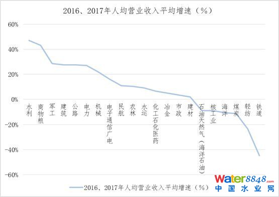 2015-2017年人均營業(yè)收入波動變化的細分行業(yè)中,水運、建材、冶金、軍工、化工石化醫(yī)藥行業(yè)的人均營業(yè)收入雖然在2016年經(jīng)歷了下滑但是2017年反彈至高位,并且這些行業(yè)2017年的人均營業(yè)收入都超過了百萬規(guī)模;而核工業(yè)、市政、電子通信廣電和海洋行業(yè)人均營業(yè)收入在2016年經(jīng)歷了一定的提升后又有所回落,2017年人均營業(yè)收入水平分別達到88萬元、87萬元、81萬元和71萬元,除了電子通信廣電行業(yè),其他三個行業(yè)相比2015年人均產(chǎn)值水平都有所下降。