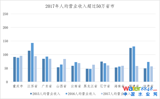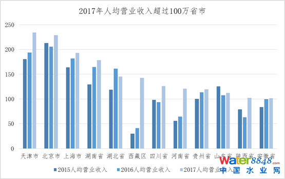 2017年人均營業(yè)收入水平超過100萬省市包括:天津市、北京市、上海市、湖南省、湖北省、西藏區(qū)、四川省、河南省、貴州省、山東省、陜西省、安徽省。