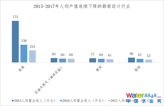 從勘察設(shè)計全行業(yè)來看,2015年、2016年和2017年營業(yè)收入分別為27089億元、33337億元和43391億元,年末從業(yè)人員分別為304萬人、320萬人和429萬人。通過計算得出勘察設(shè)計行業(yè)2015-2017年人均營業(yè)收入分別為89萬元、104萬元和101萬元。