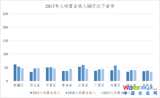 2017年人均營業(yè)收入水平50萬以下省市包括:新疆區(qū)、河北省、寧夏區(qū)、青海省、江西省、廣西區(qū)、內(nèi)蒙區(qū)、浙江省和吉林省?傮w來看這些省市人均營業(yè)收入2015-2017年變化波動不大,其中青海省、廣西區(qū)人均營業(yè)收入增勢平穩(wěn),青海省人均營業(yè)收入由2015年37萬元增加到2017年45萬元,同期廣西區(qū)人均營業(yè)收入由34萬元增加到40萬元; 而新疆區(qū)人均營業(yè)收入水平下滑相對明顯,由2015年62萬元下降到2017年47萬元,2016年、2017年同比減少13%和11%。