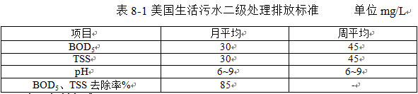 美國其城市化歷史長,鄉(xiāng)村衛(wèi)生建設(shè)起步早,不存在類似中國的城鄉(xiāng)差別,而且鄉(xiāng)村居民都比較富裕,總的來說鄉(xiāng)村污水處理水平比較高。因此,在污水排放要求方面,美國鄉(xiāng)村和城市使用相同的排放標(biāo)準(zhǔn),即達(dá)到美國《聯(lián)邦水污染防治法》規(guī)定的經(jīng)二級處理的出水限值,見表8-1。