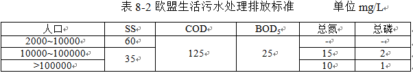 歐盟按照當(dāng)量人口規(guī)模,分級規(guī)定生活污水排放限值,具體規(guī)定見表8-2。
