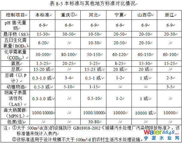 由對比表可知,本標(biāo)準(zhǔn)基于對Ⅱ、Ⅲ類水體的重點(diǎn)保護(hù),排入該類水體的標(biāo)準(zhǔn)值嚴(yán)于其他地方標(biāo)準(zhǔn),排入其它水體、設(shè)施規(guī)模較小的排放限值與其他省(直轄市)的地方標(biāo)準(zhǔn)限值基本相當(dāng)。