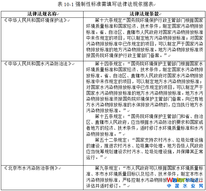 因此,建議將本標(biāo)準(zhǔn)作為強(qiáng)制性標(biāo)準(zhǔn)執(zhí)行。制訂本標(biāo)準(zhǔn)的法律依據(jù)主要是:《中華人民共和國環(huán)境保護(hù)法》、《中華人民共和國水污染防治法》和《北京市水污染防治條例》等有關(guān)法律法規(guī),具體條款見表10-1。