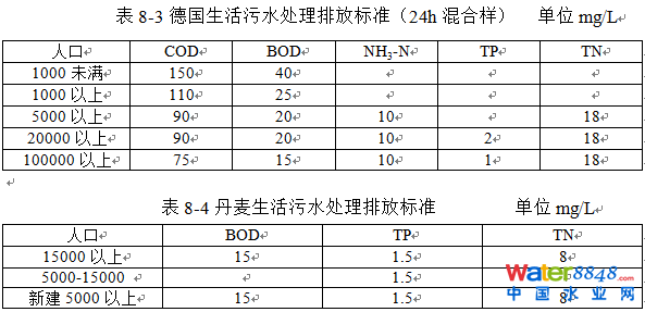 歐盟各成員國可依據(jù)本國實(shí)際情況制定生活污水排放限值,確保水質(zhì)目標(biāo)的實(shí)現(xiàn)。德國、丹麥的生活污水排放限值分別見表8-3和表8-4。
