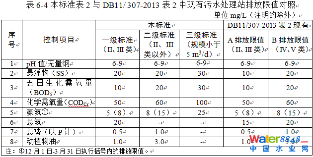 這部分現(xiàn)有農(nóng)村生活污水處理設(shè)施在本標(biāo)準(zhǔn)實(shí)施前執(zhí)行DB11/ 307-2013表2中現(xiàn)有污水處理站排放限值。本標(biāo)準(zhǔn)對這部分現(xiàn)有處理設(shè)施排放限值要求執(zhí)行本標(biāo)準(zhǔn)表2的規(guī)定。本標(biāo)準(zhǔn)表2與DB11/ 307-2013表2中現(xiàn)有污水處理站排放限值比較見表6-4。