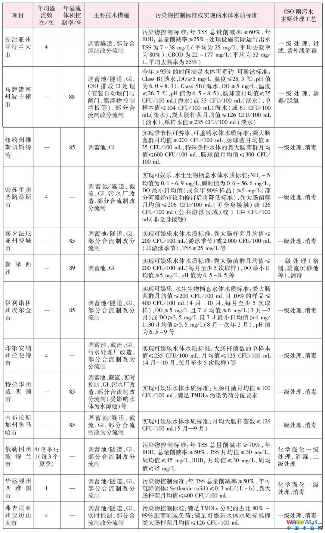 美國(guó)具有針對(duì)性的CSO控制是從1989年8月10日EPA發(fā)布CSO控制策略(CSO Control Strategy)開始的。該策略的主要目的是:①確保旱天不發(fā)生溢流;②使所有雨天CSO排放口滿足CWA基于技術(shù)和基于水質(zhì)的排放限值要求;③最小化對(duì)水體水質(zhì)、水生生物、人類健康的影響。