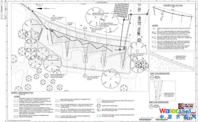 整個雨水規(guī)劃中的幾個大型雨水滯留區(qū)都很好的結(jié)合地形設計,由于地勢東高西低,在場地的西邊緣最低洼處,規(guī)劃了一個可作為公園綠地使用的大型滯水區(qū)域,下暴雨時可滯留大量雨水從而起到防洪作用,平時是可進入的休閑綠地。雨水順應東高西低的地勢沿地表可形成溪流景觀。
