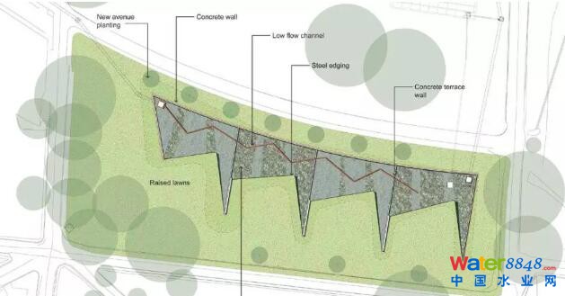 經(jīng)過設計,整個的雨水花園每年將吸收16,000公斤的固體懸浮顆粒,同時通過植物生長吸收160公斤的營養(yǎng)鹽、氮等一些元素,減少垃圾產(chǎn)量。同時地下存水的過濾水將達200千升,提供每年公園所需灌溉水的60%。
