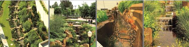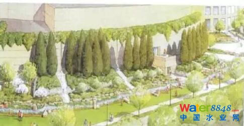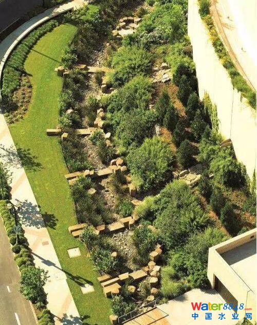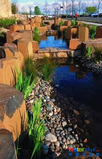 波特蘭位于美國的西北部,受季風氣候影響,是一個多雨城市,解決過多的雨水問題就成了波特蘭市的首要問題。由邁耶·瑞德景觀建筑事務所設計的波特蘭會議中心的“雨水園”,成功的解決了雨水排放和初步凈化處理問題。設計師利用當?shù)厮、植物根系、沙石以及土壤特性,將渾濁的雨水進行凈化、沉淀,經(jīng)過過濾干凈清潔的水透過土壤被下滲到土地下,解決了雨水排放和過濾問題,同時還創(chuàng)造了美景。