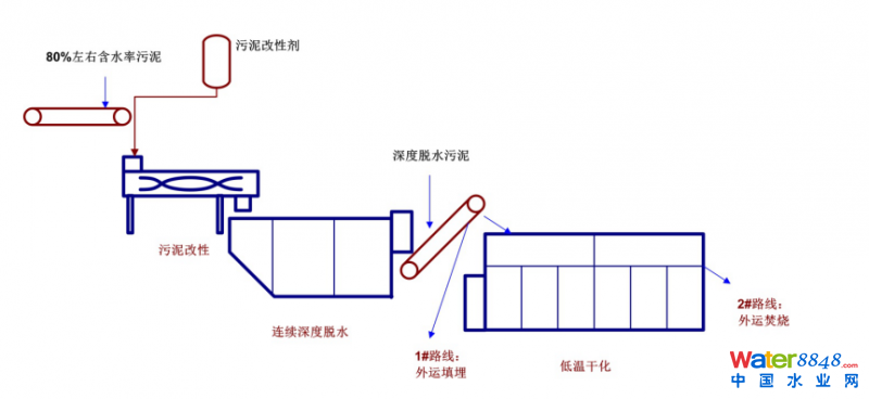 污泥經(jīng)改性、深度脫水后含水率降低至60%,隨后送至生活垃圾填埋場(chǎng)混合填埋。