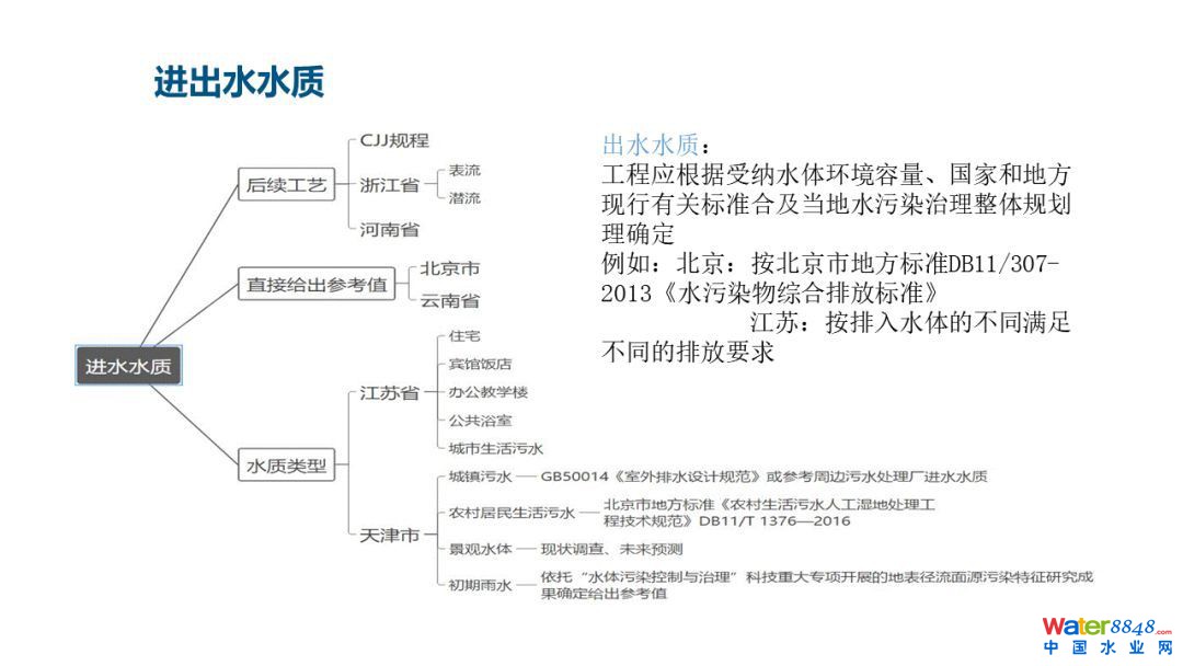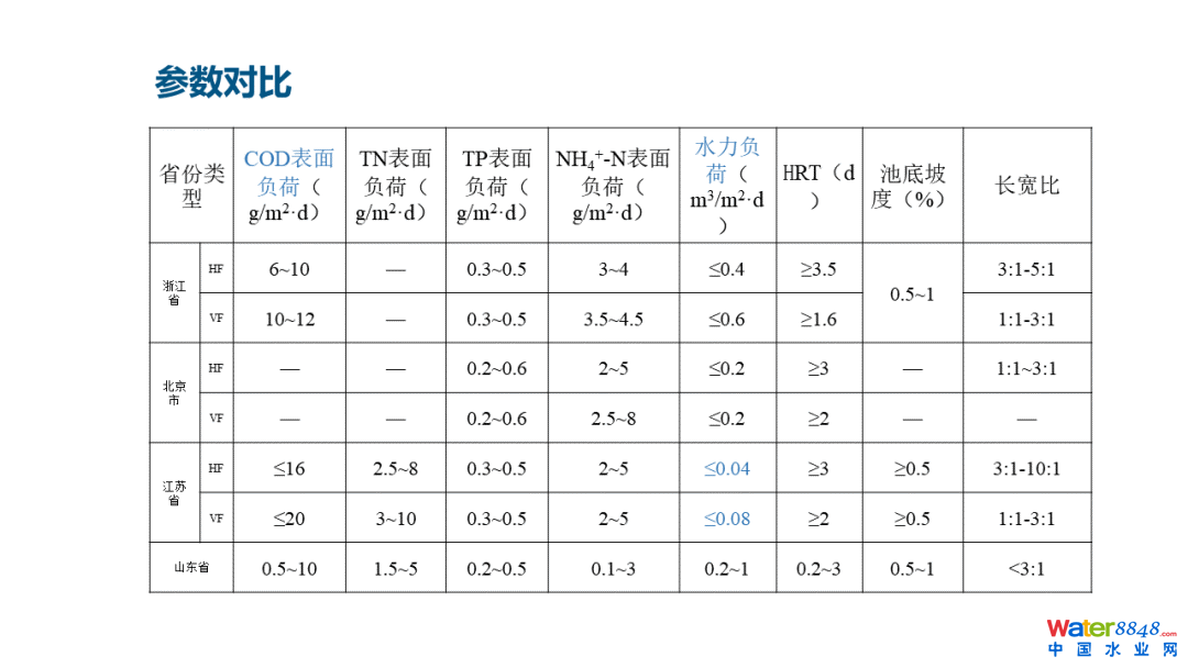 我國各地區(qū)在國家規(guī)范指導下發(fā)布更具針對性的省級人工濕地設計規(guī)程,其處理水質、處理規(guī)模及濕地設計中涉及的各項內容等均存在一定不同點。